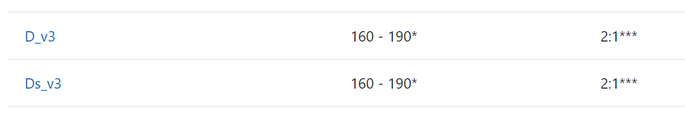 Secondly there is the metric "vCPU: Core" to concider. This ratio indicates that the underlying CPU on the hosts are hyperthreaded. This is shown by a range of ACU and 3 asterix (***) next to the ratio.