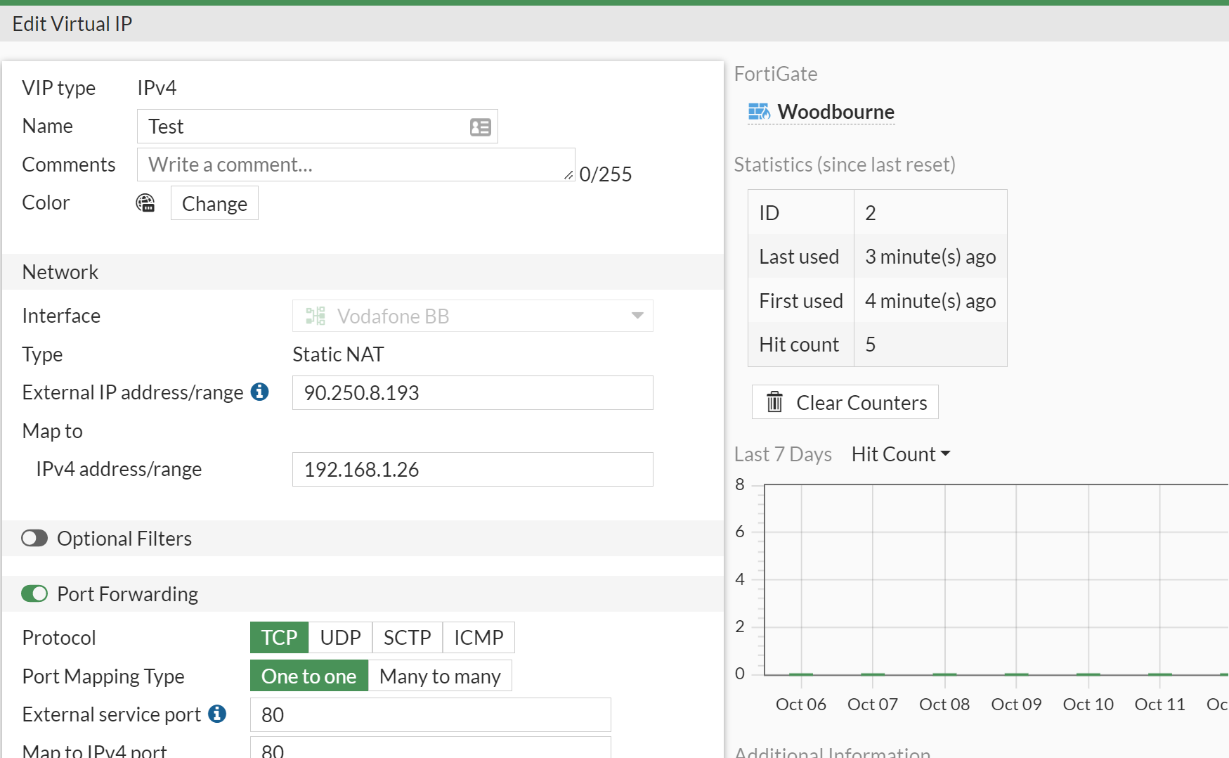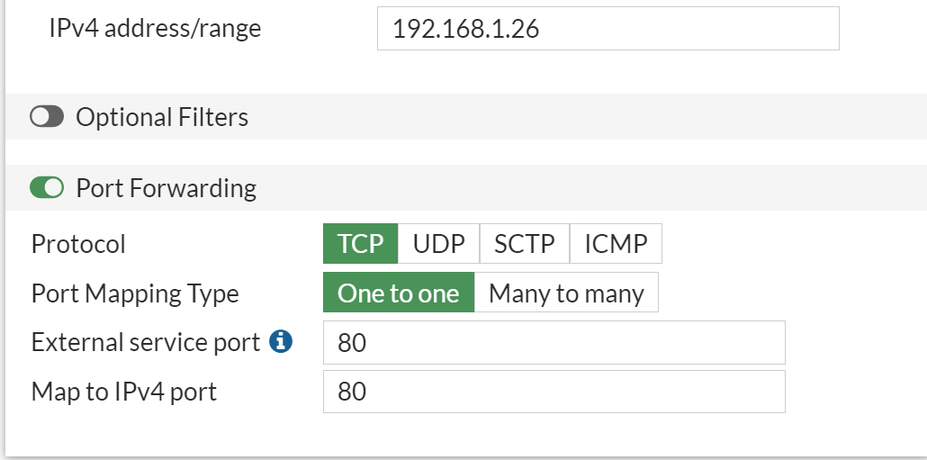 If i was NAT'ing the whole IP I could stop there but we just want traffic from port 80. So we need to flick the switch called 'Port Forward'