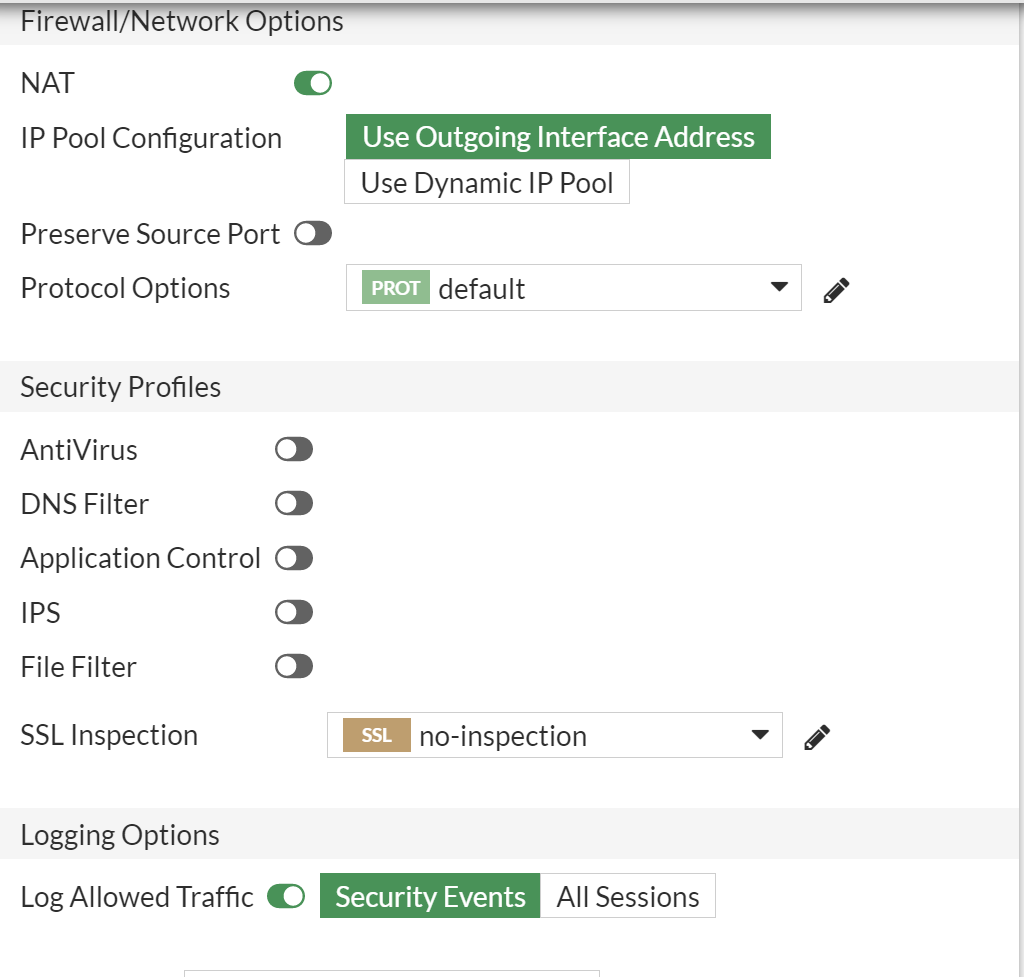 Now in the next section, we want 'NAT' on as we are nat'ing this traffic, but you can leave the rest as the default. Here you can also apply some of the advance features of the fortigate such as AV and IPS. I am not going to cover that in this guide.