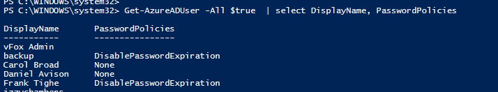 Get-AzureADUser -All $true | select DisplayName, PasswordPolicies