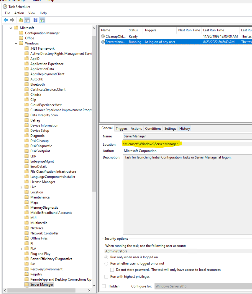 schtasks.exe /change /tn "\Microsoft\Windows\Server Manager\ServerManager" /disableThis will disable server manager at start up and prevent this message. This path is correct for Windows 2016. It may be slightly different in other server versions (I'm pretty sure it is).