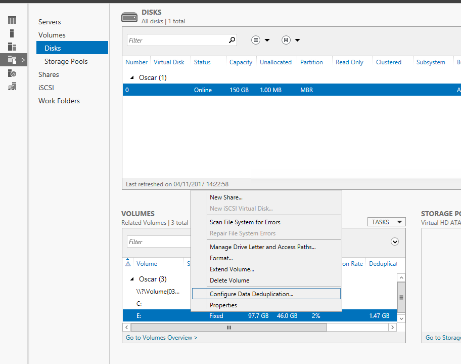 Once this completes if you open server manager you will see File and Storage services listed as a function of that server. Dedupe can be configured there